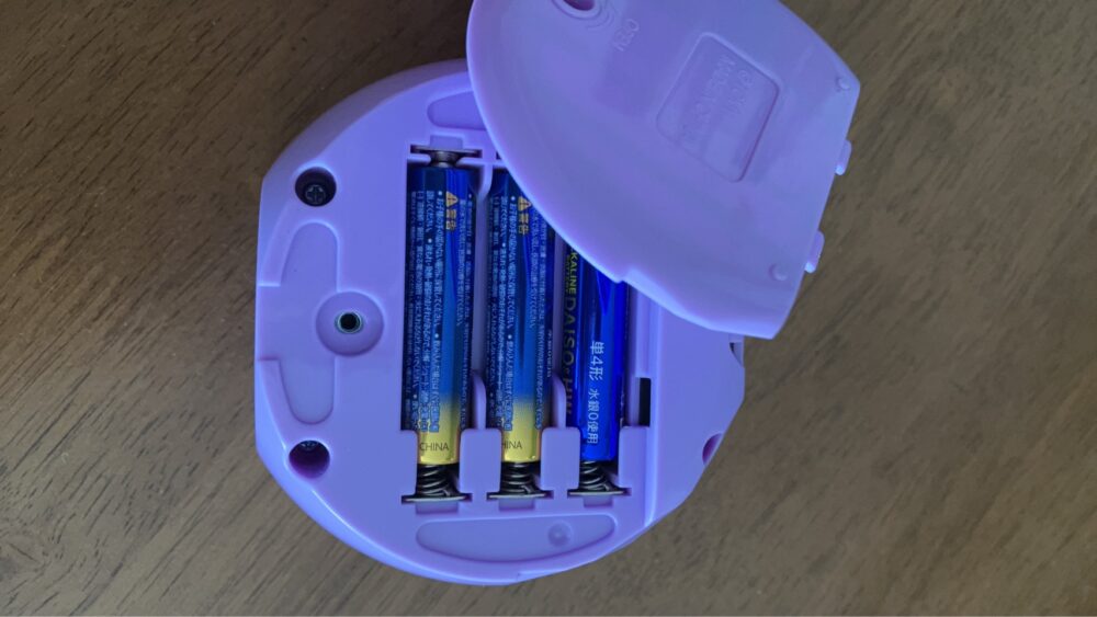 わが家では、常備しているダイソーのアルカリ電池(100円)を使用しました。
